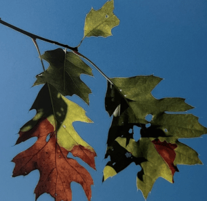 叶子的一端通常是绿色的,另一端是棕色的,两个区域之间有明显的界线。